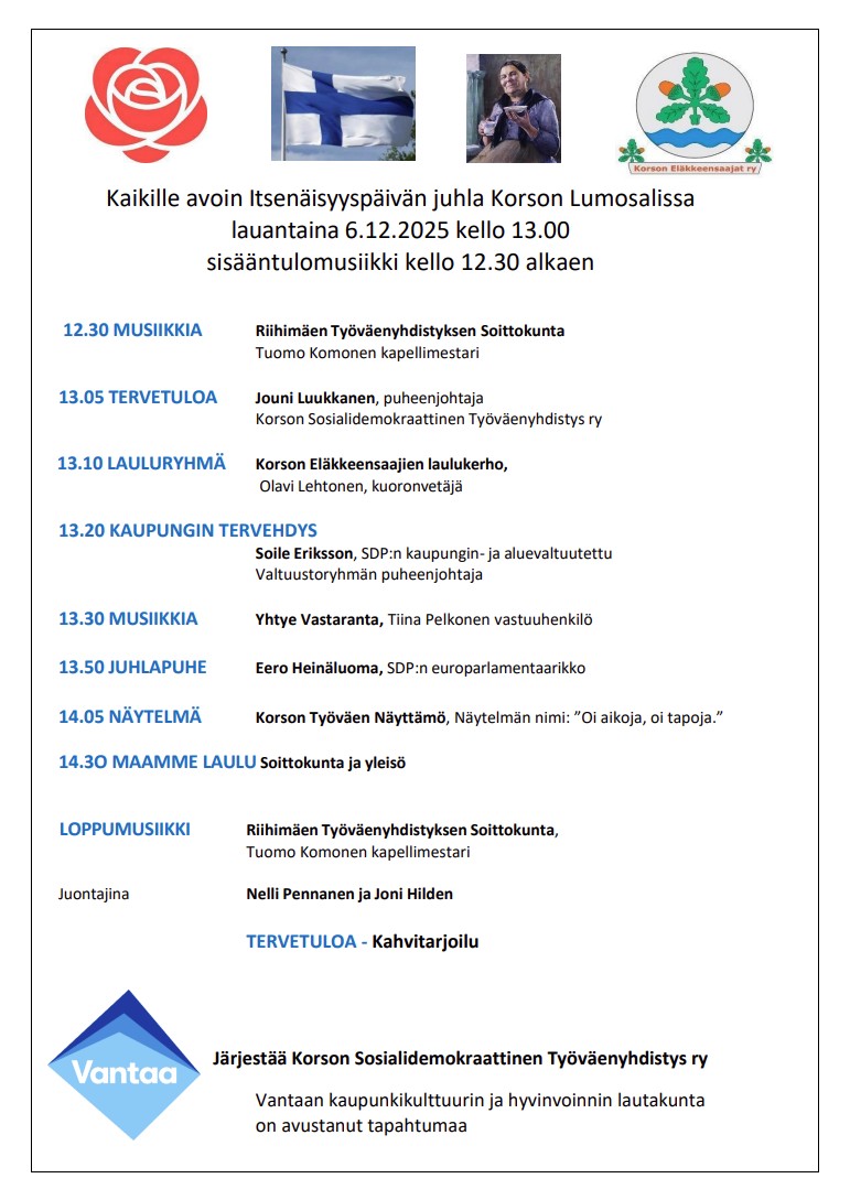 SDP Korso on Suomen Sosiaalidemokraattisen Puolueen paikallisosasto ja yhdistys. Toimimme ihmisoikeuksien, tasa-arvon, demokratian ja solidaarisuuden edistämiseksi Vantaan Korsossa.